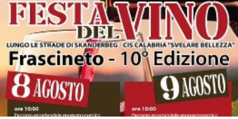 Tutto pronto per la decima edizione della Festa del Vino. 8 e 9 agosto, a partire dalle ore 10, si partirà con le celebrazioni della cultura vitivinicola di Frascineto, terra di storia arbëreshë, di religione bizantina, di forte e consapevole identità.