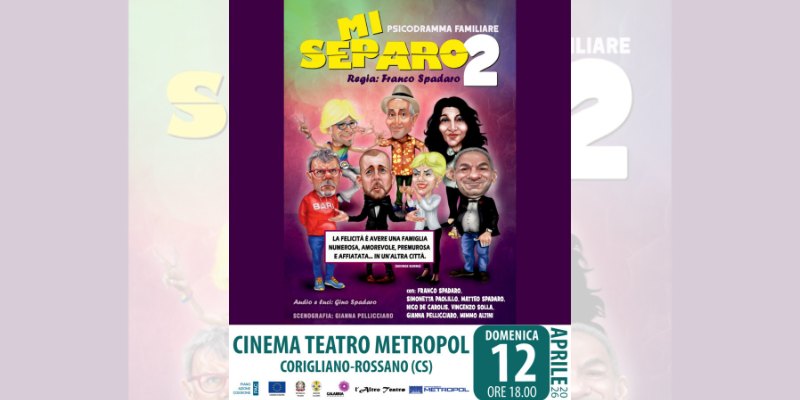 Domenica 12 aprile, alle ore 18.00, al Cinema Teatro Metropol di Corigliano Rossano andrà in scena lo spettacolo comico “Mi Separo 2”, sequel della fortunata commedia “Mi Separo”, con Franco Spadaro, Simonetta Paolillo, Matteo Spadaro, Nico De Carolis, Vincenzo Solla, Gianna Pellicciaro e Mimmo Altini.