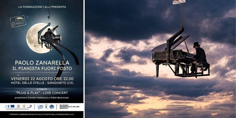 Sarà vicino al mare, quando la luna calante accennerà solo a un sottile sorriso luminoso, che da un pianoforte oscillante nell’aria, saliranno le note poetiche di Paolo Zanarella. Tenendo un po’ tutti col fiato sospeso per quel palcoscenico invisibile, suonerà i classici della musica italiana e internazionale. Zanarella, musicista ma anche artista di strada sui generis (o in strada, come ama dire), replicherà il suo modo visionario di suonare in piazze di tutta Italia, portando da oltre quindici anni le sue esibizioni estemporanee tra la gente, o con il pianoforte sospeso sul Canal Grande di Venezia, come già accaduto in Calabria, quando si esibì sul lago Arvo. Un po’ musicista e un po’ mago, col frac e il cilindro d’altri tempi, il pianista fuori posto farà scoprire lo stupore e la meraviglia di una musica che, fuori posto, non lo è mai.