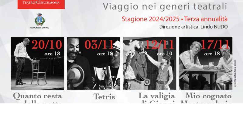 La rassegna prosegue il 3 novembre, sempre alle 18, con “Tetris”, testo di Ciro Lenti portato in scena da Antonio Filippelli e Marco Silani per la compagnia Sm.Art di Cosenza. A seguire, il 12 novembre alle 10 (matinée per le scuole), “La valigia di Gianni”, spettacolo di marionette scritto, realizzato e interpretato da Angelo Gallo per Teatro della Libellula con la condivisione di Teatro Rossosimona.