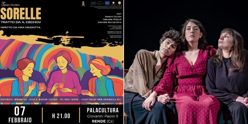In prima assoluta Sorelle, il nuovo spettacolo della compagnia “Libero Teatro“, il 7 febbraio alle ore 21 al Palacultura di Rende. Lo spettacolo, diretto dal regista cosentino Max Mazzotta, è una rivisitazione in chiave contemporanea di uno testi classici più importanti e conosciuti del teatro, le “Tre Sorelle” di Anton Cechov.