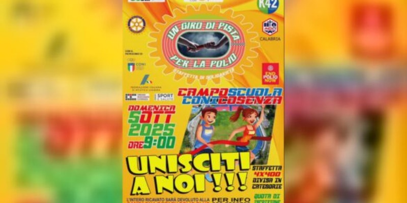 Il traguardo è vicino, serve l’ultimo scatto e la Rotary Foundation continua con grande impegno la corsa per l’eradicazione della Polio nel Mondo. La Commissione Polio Plus del Club Rotary Mendicino Serre Cosentine, facendo proprio l’incoraggiamento della Rotary Foundation affinché ogni Club Rotary contribuisca con una donazione di almeno 1500 USD annui alla Campagna Polio plus, ha organizzato (in collaborazione con U.S. ACLI e ASD K42 COSENZA e patrocinio FIDAL) la staffetta di solidarietà “Un giro di pista per la Polio”. Una specialità scelta dal Rotary per il duplice simbolismo che racchiude: il giro di pista che rappresenta la ruota del Rotary e il desiderio dei Soci di rendersi utili e la staffetta come passaggio di consegne tra il Presidente uscente e il Presidente insignito per l’anno rotariano successivo.