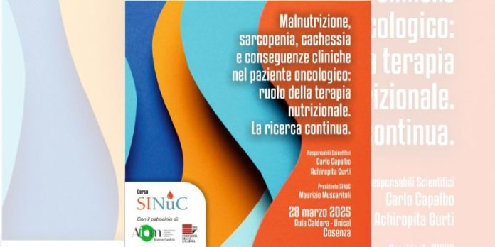 Il prossimo 28 marzo, venerdì, nell’aula Caldora dell’Unical, dalle 8,30 alle 18,30, si discuterà di “malnutrizione, sarcopenia, cachessia e conseguenze cliniche nel paziente oncologico: ruolo nella terapia nutrizionale. La ricerca continua”. I responsabili scientifici sono Carlo Capalbo e Achiropita Curti. Presidente Sinuc, Maurizio Muscaritoli. L’evento è accreditato Agenas ed è organizzato dal provider Xenia di Francesca Mazza. È un corso Sinuc, con il patrocinio di Aiom, associazione italiana oncologia medica, e Università della Calabria.