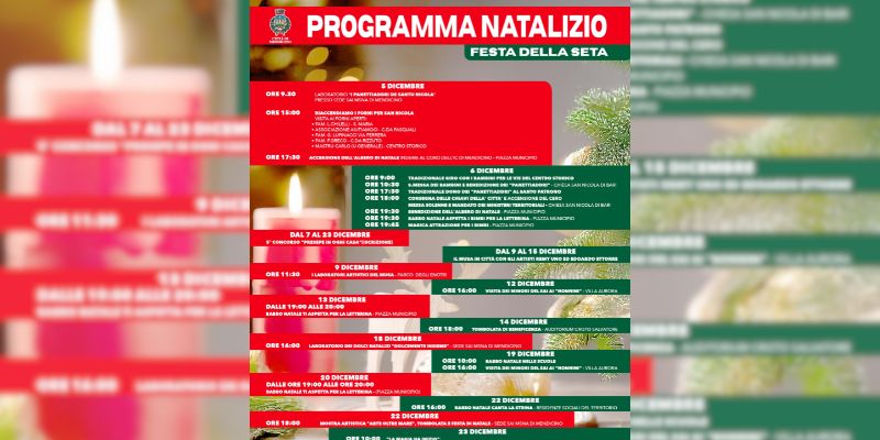 Il Comune di Mendicino è lieto di presentare il Programma Natalizio 2025 – Festa della Seta, un calendario ricco, diffuso e profondamente radicato nella nostra identità, che accompagnerà l’intera comunità dal 5 dicembre fino all’Epifania. Un mese di iniziative pensate per tutte le età, tra tradizioni antiche, momenti di condivisione, musica, creatività e l’inconfondibile calore del Natale mendicinese.