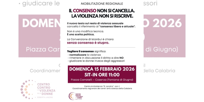 Il Centro Antiviolenza “Roberta Lanzino”, di concerto con il CADIC (Coordinamento regionale dei centri antiviolenza), invita alla: “massima partecipazione al sit-in che si svolgerà nei pressi della Fontana di Giugno a Cosenza per manifestare forte il dissenso verso un testo, quello sul reato di violenza sessuale, che mina l’auto determinazione e la tutela delle donne e segna un arretramento culturale senza precedenti”, si legge in un comunicato congiunto.