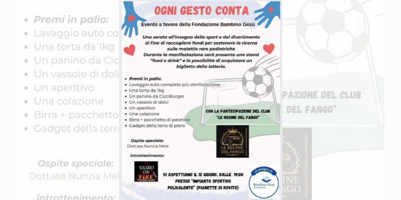 Lo scopo é quello di raccogliere fondi da devolvere interamente alla Struttura Ospedaliera Pediatrica “Bambino Gesú” di Roma, per dare un contributo alla ricerca contro le malattie genetiche rare infantili, argomento che tocca principalmente le ragazze di Rovito e l’intera comunità. Come si può leggere nella locandina c’é una vendita di biglietti al costo di 5€ i quali verranno sorteggiati per vincere i premi messi a disposizione dagli sponsor, l’ingresso invece sarà ad offerta libera, ci sarà uno stand gastronomico il quale incasso andrà anch’esso devoluto interamente, inoltre ci sarà la presenza straordinaria del Sindaco, dell’assessore allo sport del Comune di Rovito, e della Pediatra la Dottoressa Nunzia Mele.
