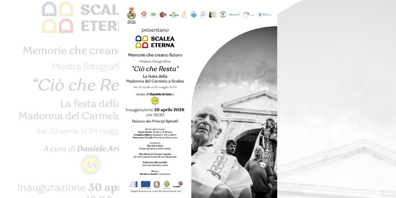 Da questa consapevolezza nasce “Ciò che resta – La festa della Madonna del Carmelo a Scalea”, la mostra fotografica di Daniele Arieta, a cura dello stesso autore e di AssoScalea, dedicata a uno dei momenti più intensi e identitari della tradizione popolare cittadina. L’inaugurazione si terrà giovedì 30 aprile 2026 alle ore 19:00 presso il Palazzo dei Principi Spinelli. Interverranno per i saluti istituzionali il Sindaco Mario Russo, l’Assessore alla Cultura Annalisa Alfano e il Presidente di AssoScalea Francesco Casella.