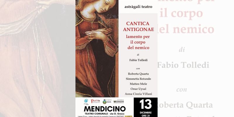 Ci sono storie che non smettono di bussare alla nostra epoca, e una di queste è Antigone. Sabato 13 dicembre, alle ore 18, il Teatro Comunale di Mendicino ospiterà “Cantica Antigonae – lamento per il corpo del nemico”, la nuova e attesissima produzione di Astràgali Teatro, nell’ambito dell’ottava edizione di Sguardi a Sud – Suoni e visioni del presente 2025. La rassegna, ideata da Porta Cenere con la direzione artistica di Mario Massaro e sostenuta dalla Fondazione Carical con il patrocinio del Comune di Mendicino, conferma ancora una volta la propria capacità di portare in scena lavori che interrogano il mondo di oggi con forza e lucidità. La vicenda è nota, ma la sua risonanza resta sorprendentemente attuale. Antigone, travolta dalla maledizione familiare e dal conflitto fratricida tra Eteocle e Polinice, decide di compiere un gesto che la contrappone al potere: dare sepoltura al fratello considerato traditore. Un atto semplice e definitivo, capace di incrinare un ordine fondato sulla paura e sulla punizione. Di fronte alle guerre e ai conflitti che attraversano il nostro presente, quel gesto diventa una domanda diretta: fino a che punto siamo disposti a difendere la vita e la dignità, anche quando riguarda “l’altro”?