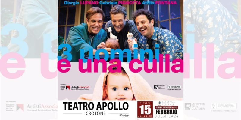 “Tre uomini e una culla” è uno degli appuntamenti previsti nella rassegna “Crotone… Voglia di Teatro”, ideata da Gianluigi Fabiano. La Rassegna, organizzata dalla GF Entertainment, rientra nella Rete di Distribuzione “L’ALTRO TEATRO”, co-finanziato con risorse PSC Piano di Sviluppo e Coesione 6.02.02 erogate ad esito dell’Avviso “Programmi di Distribuzione Teatrale” dalla Regione Calabria – Dipartimento Istruzione Formazione e Pari Opportunità – Settore Cultura”, e con il patrocinio gratuito dell’amministrazione comunale di Crotone. Gli ultimi biglietti disponibili sono acquistabili sul circuito diyticket.it.