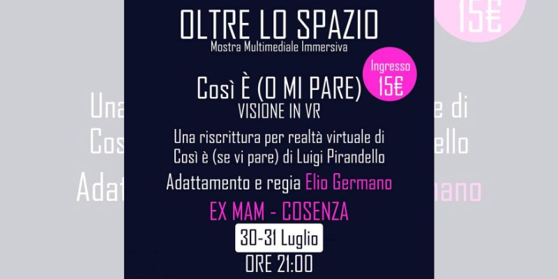 Un grande appuntamento chiuderà il progetto “Oltre lo Spazio”. Per la prima volta a Cosenza, l’attore e regista teatrale Elio Germano proporrà al pubblico una riscrittura virtuale di Così è (se vi pare) di Luigi Pirandello. Un classico, come quello del drammaturgo siciliano, è stato adattato alla nostra società mediatica, dove “spiare” l’altro risulta ancora più semplice grazie all’uso dei social network.
