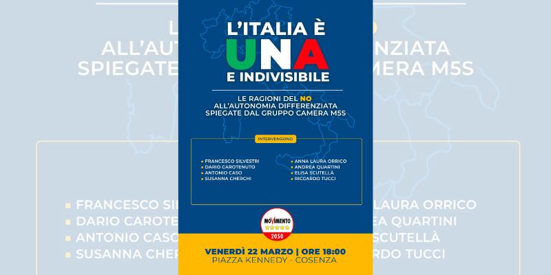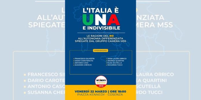 “Venerdì 22 marzo in piazza Kennedy a Cosenza, dalle ore 18:00, il Capogruppo del Movimento 5 stelle alla Camera dei deputati Francesco Silvestri, insieme ad una rappresentanza di parlamentari pentastellati provenienti da tutta Italia, incontrerà attivisti e cittadini per spiegare le ragioni del no all’Autonomia differenziata“.