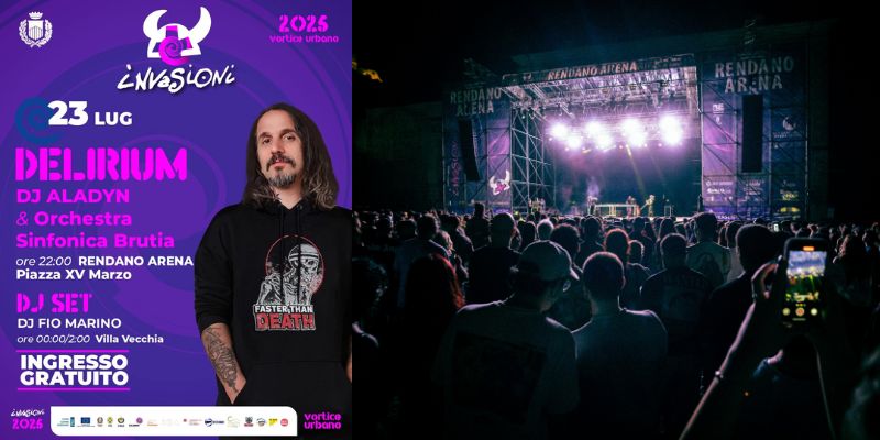 La terza giornata del Festival promette uno show esplosivo. Alle ore 22.00, sul palco di Invasioni 2025, prenderà vita DELIRIUM, un evento unico che unisce la musica sinfonica all’energia della dance. Protagonisti della serata saranno DJ Aladyn – icona del turntablism italiano e voce di punta di Radio Deejay – e l’Orchestra Sinfonica Brutia. Un mix inedito di armonie classiche ed elettroniche: lo scratch si fonde con gli archi e i fiati, dando vita a un vortice sonoro e visivo che conquisterà il pubblico di Cosenza.