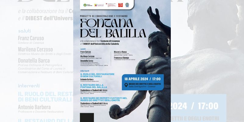 Il Sindaco Franz Caruso ha rivolto un particolare ringraziamento all’Assessore all’urbanistica Pina Incarnato “che si è molto spesa per attivare il progetto di conservazione e restauro, unitamente al Presidente della commissione urbanistica, Francesco Turco e alla direttrice del Museo dei Brettii e degli Enotri, Marilena Cerzoso”. “La sinergia istituzionale tra il Comune e l’Università della Calabria – ha affermato l’Assessore all’urbanistica Pina Incarnato – si rafforza ulteriormente in un ambito particolarmente significativo come è quello del restauro e della conservazione dei monumenti. Prontamente il DiBEST dell’Università della Calabria, a seguito dei sopralluoghi compiuti per valutarne lo stato di conservazione e di degrado, ha redatto, a cura di uno dei suoi tecnici restauratori, il Prof. Antonio Barbera, un dettagliato progetto di conservazione e restauro della Fontana del Balilla, con relativa analisi storico-critica e stilistica dell’opera ed un puntuale corredo fotografico e le schede tecniche dell’intervento che consentiranno ora di passare allo step successivo che sarà quello del restauro vero e proprio. Si tenga conto anche del fatto che il restauro dei beni di materiale lapideo, ad opera dei docenti e degli studenti dell’Unical, consentirà di intervenire anche sulle opere del MAB”.