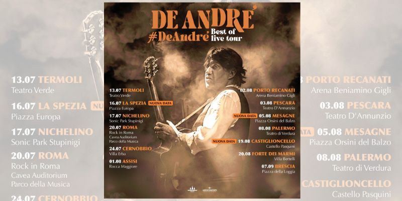 Questa estate CRISTIANO DE ANDRÉ si esibirà in concerto in tutta Italia con “De André #DeAndré – Best Of Live Tour”, un omaggio al padre Fabrizio, a 25 anni dalla sua scomparsa, e alle sue canzoni impresse nella memoria collettiva e ancora estremamente attuali.