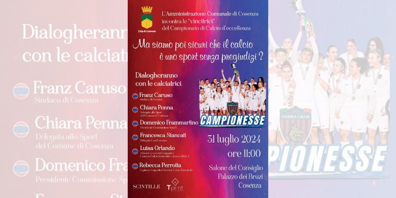 Mercoledì prossimo 31 luglio il Sindaco Franz Caruso e l’Amministrazione comunale incontreranno le campionesse del Cosenza calcio femminile, vincitrici del campionato d’eccellenza. La manifestazione, promossa dal Comune, in collaborazione con Scintille e Tprint, è in programma alle ore 11,00 nella sala consiliare di Palazzo dei Bruzi. L’iniziativa sarà l’occasione per celebrare i successi conseguiti nell’ultimo campionato disputato dal Cosenza calcio femminile nel corso del quale le ragazze allenate da Luisa Orlando avevano conquistato sul campo la serie C. Purtroppo, la mancata iscrizione al campionato, non consentirà di dare seguito ad un successo maturato nel corso di una lunga e appassionante stagione.