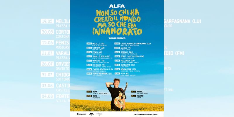 E’ partito il 19 maggio “NON SO CHI HA CREATO IL MONDO MA SO CHE ERA INNAMORATO TOUR ESTIVO“ il nuovo tour estivo di Alfa che prende il nome dal suo ultimo lavoro uscito a febbraio. L’album, composto da dieci canzoni, contiene “Vai!” (certificato discodi platino), il brano presentato al Festival di Sanremo con cui ha conquistato giovani e meno giovani, insieme all’emozionante duetto con Roberto Vecchioni, portandolo ad essere considerato la rivelazione del Festival.