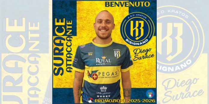 Colpo grosso del Kratos Bisignano, uno di quegli acquisti che fanno rumore! Acquisite le prestazioni sportive di 𝐃𝐈𝐄𝐆𝐎 𝐒𝐔𝐑𝐀𝐂𝐄, forte attaccante classe ’95, un concentrato di esperienza e qualità, segni distintivi: letale sotto porta.