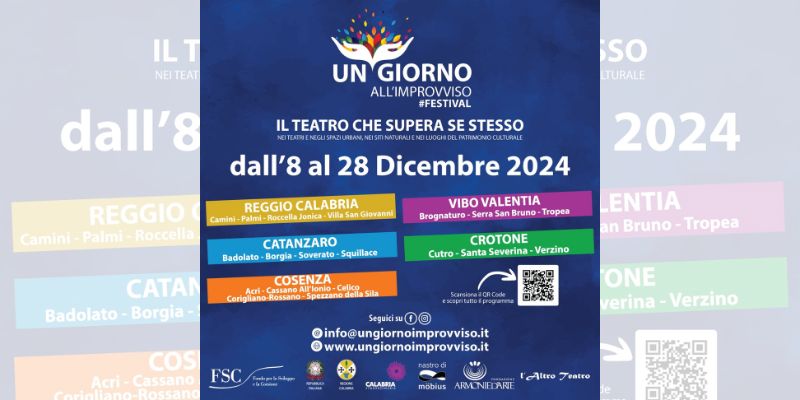 Ritorna, per il secondo anno consecutivo, “Un giorno all’improvviso #Festival – Il Teatro che supera se stesso“, il nuovo progetto speciale firmato da Fondazione Armonie d’Arte, L’Altro Teatro e Nastro di Mobius, che dall’8 al 28 dicembre animerà le 5 province della Calabria con un cartellone di 60 appuntamenti, in oltre 30 location diverse.