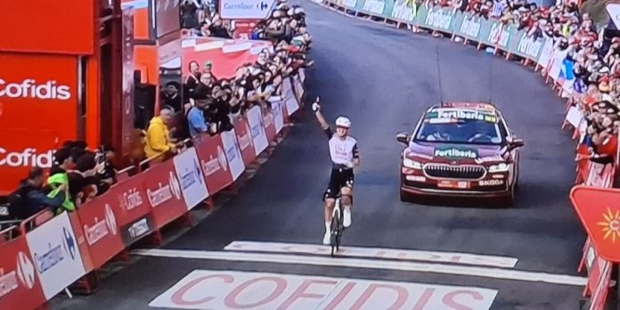 Sulla penultima salita (Alto de la Comella), Vine si avvantaggia sui compagni di fuga ed inscena una sorta di cronometro; procede con passo potente e regolare, portando il suo vantaggio fino ad un minuto. Nel gruppo, lavora la Lidl – Trek in funzione di Ciccone; il ritmo imposto dalla formazione dell’abruzzese fa sì che Ayuso, secondo in classifica generale, si stacchi clamorosamente ed esca subito di classifica.